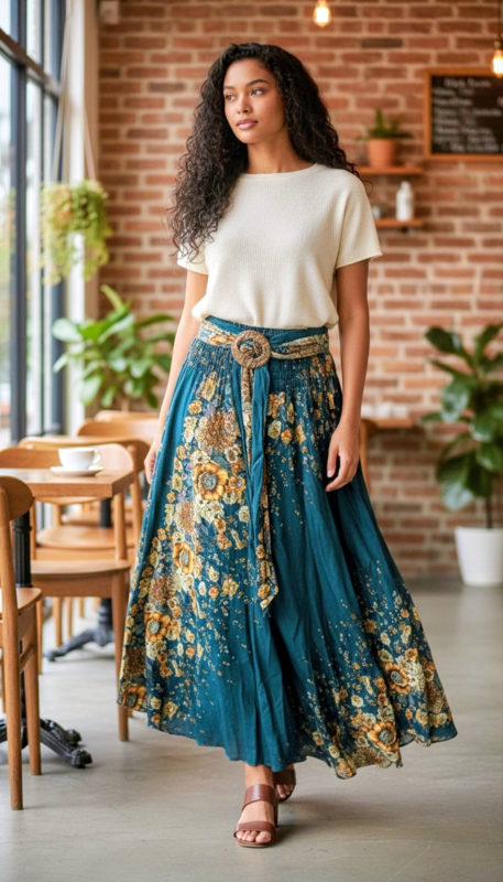 Thaise rok met gesp / Petrol met bloemenThaise rok met cocosnoot gesp.